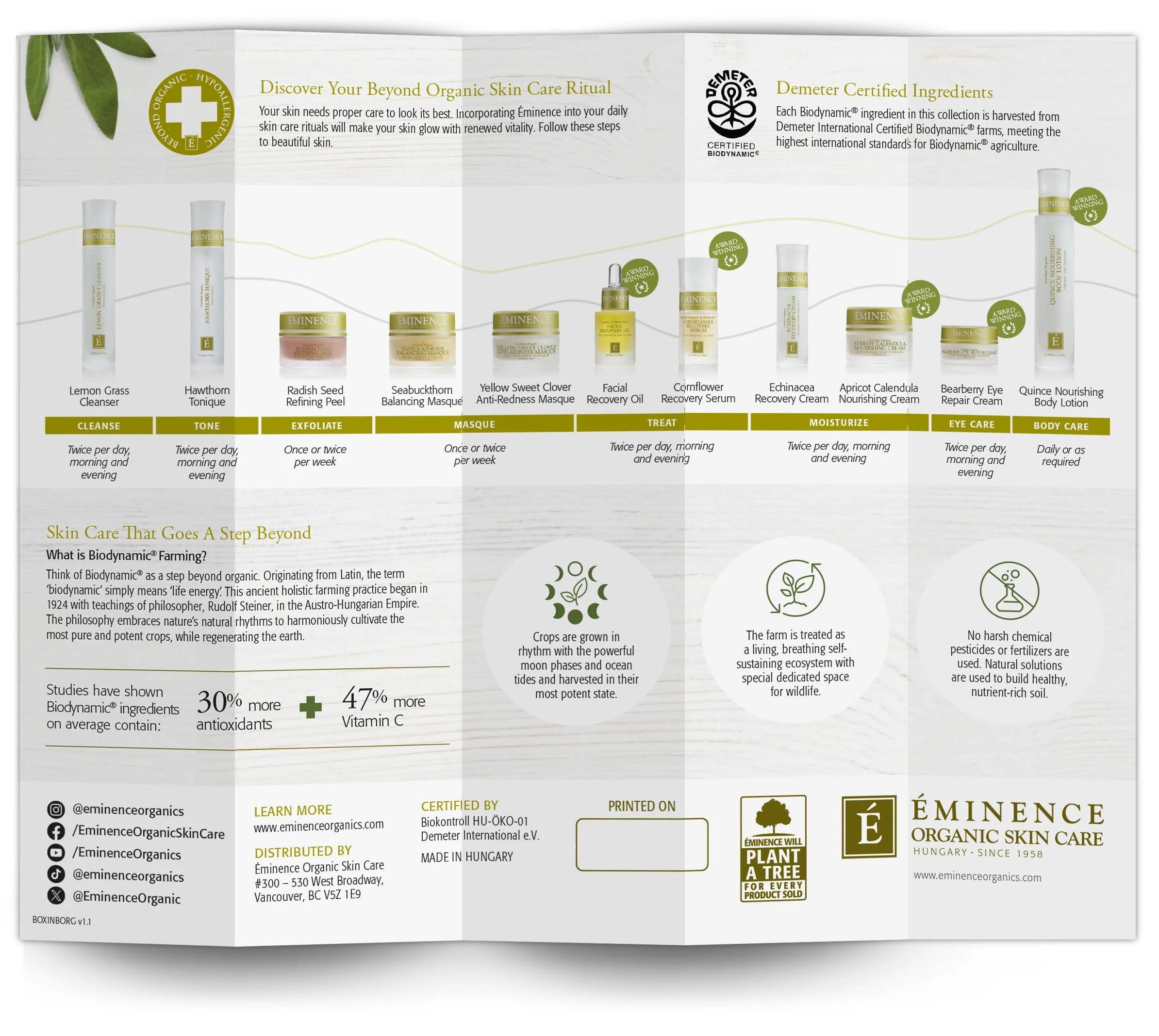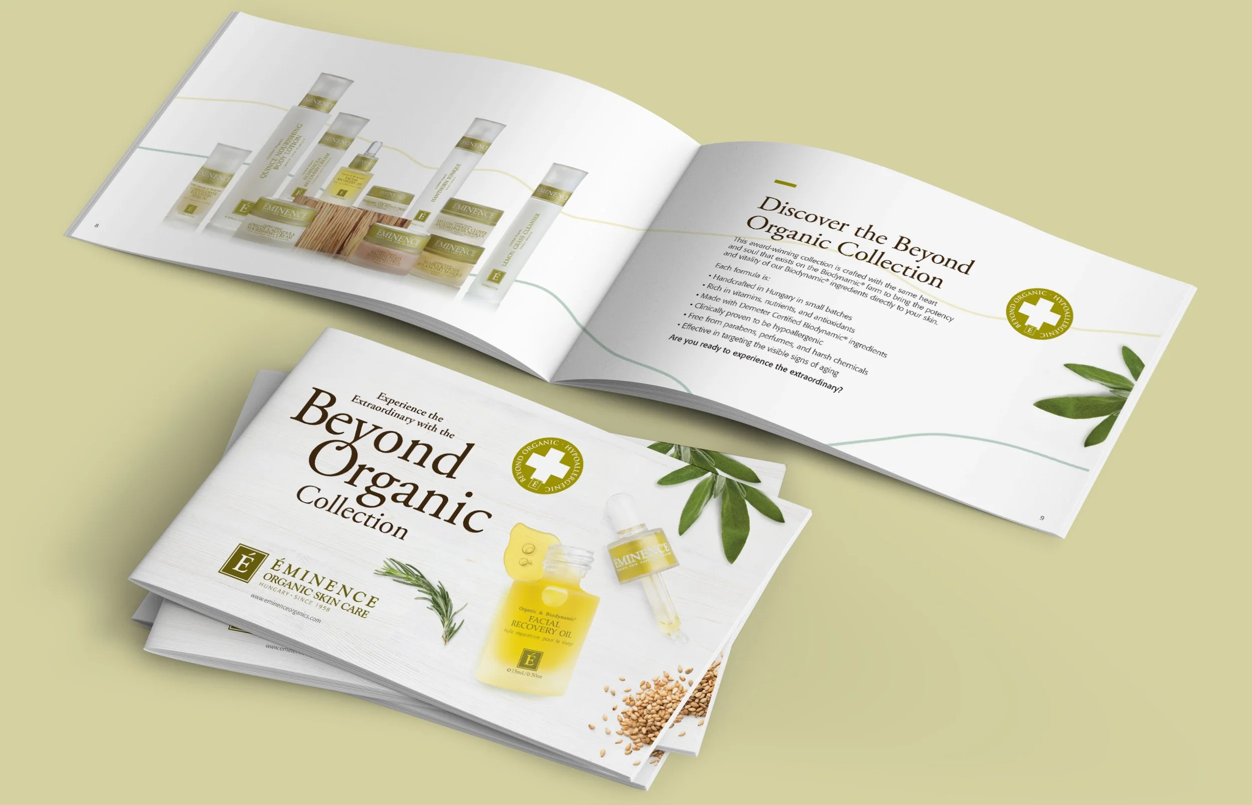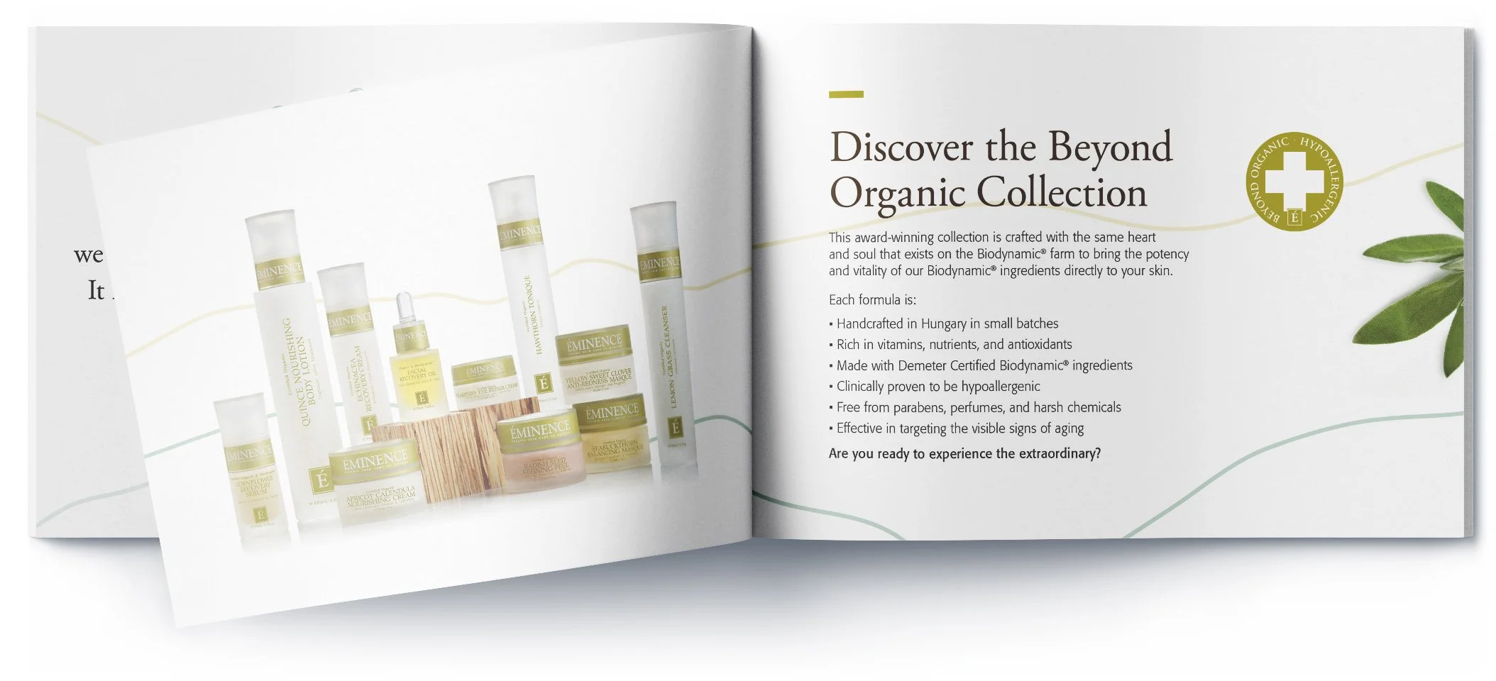 The Beyond Organic Collection, a premium line within the Eminence portfolio, was refreshed with updated photography, refined visuals, and a new brand booklet and product insert to re-energize the collection.