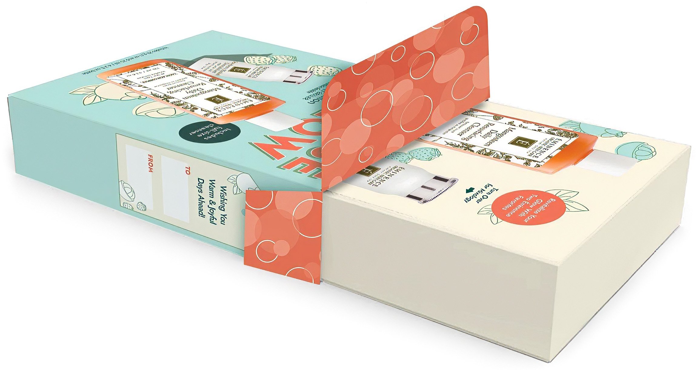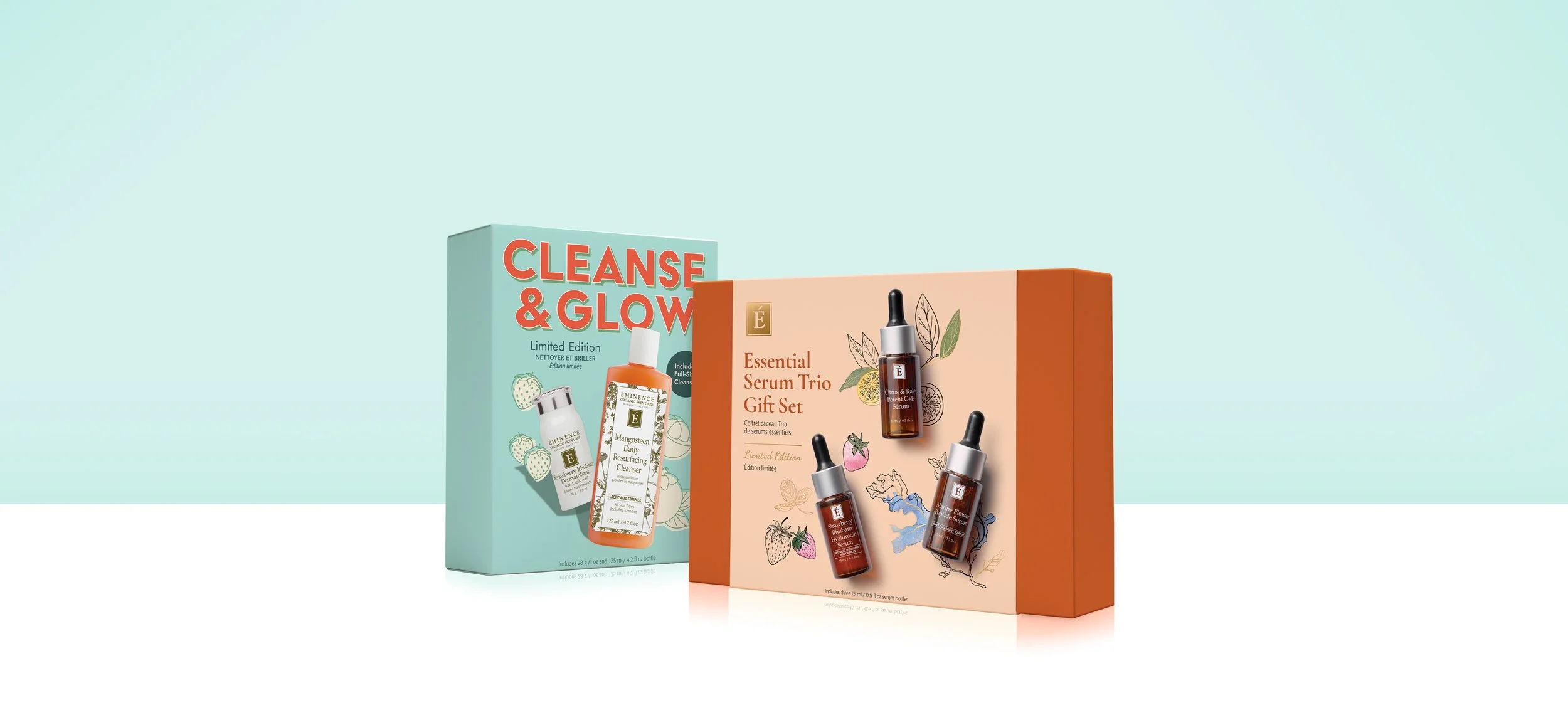 The custom box was designed with a premium opening experience in mind, using gold foil, refined finishes, and a sophisticated colour palette that intentionally paired with the lower-priced Cleanse & Glow set. The design also paired product photography with ingredient illustration to highlight the array of key ingredients behind each formula.